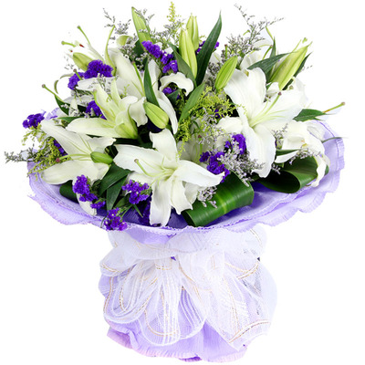 22朵香水百合花束,巴西叶,黄莺勿忘我点缀。