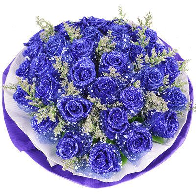 每朵蓝妖用蓝色雪点纱网包裹,内衬白色素纸,外层紫色素纸圆形包装,紫色缎带束扎花语:我对你的爱,像那蓝色萤火,在黑夜里闪放着迷人的光!附送: