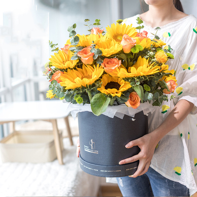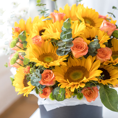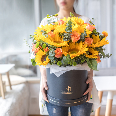 12朵向日葵,11朵金辉玫瑰(或香槟玫瑰),小雏菊,尤加利叶等搭配