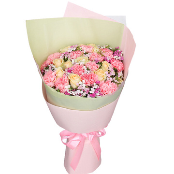 粉色和淡黄色牛皮纸扇形包装,玻璃纸内衬束腰,粉色缎带束扎花语:我要把我最衷心的祝福送给你,愿你幸福平安。附送: