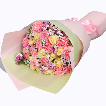 13朵粉色康乃馨,11朵香槟玫瑰,粉色石竹梅丰满间插