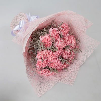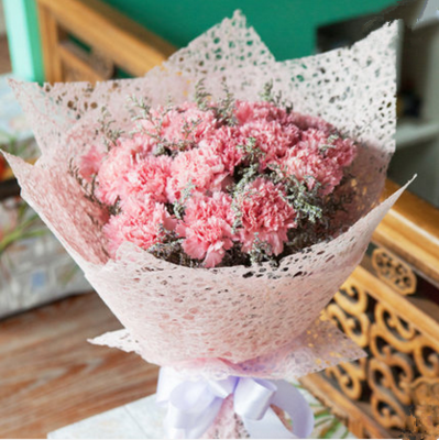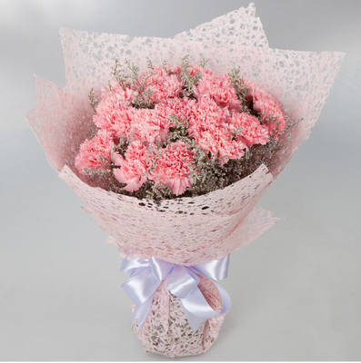 粉色镂空硬皮纸包装,紫色蝴蝶结花语:感恩的心,感谢有你。附送: