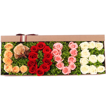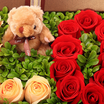 9朵戴安娜玫瑰、10朵红玫瑰、6朵香槟玫瑰、10朵白玫瑰摆成LOVE、一个小熊、黄杨叶铺垫