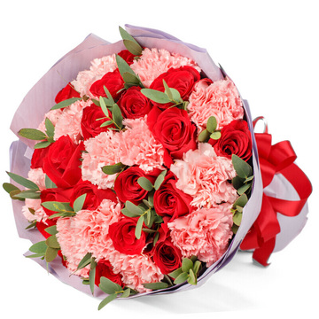 19朵红玫瑰,16朵粉色康乃馨,绿叶搭配