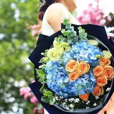 9朵香槟玫瑰,绣球、相思梅、桔梗、尤加利叶、叶上花点缀。