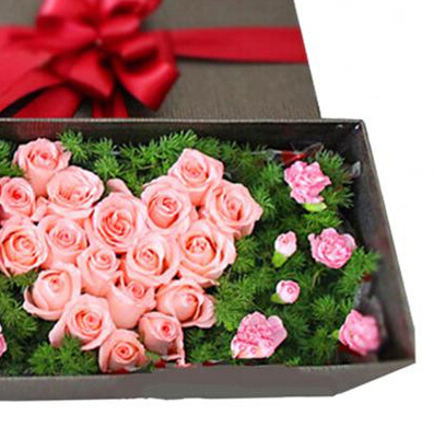 18支红玫瑰,18支戴安娜玫瑰,8支多头粉色康乃馨,蓬莱松点缀