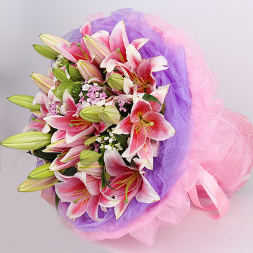 7枝多头粉色香水百合,黄莺+栀子叶+相思梅丰满搭配。