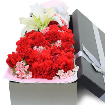 19朵红色康乃馨,粉色石竹梅丰满间插,1枝多头白百合