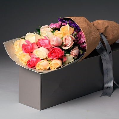 19朵混搭玫瑰,勿忘我点缀,礼盒包装。(白玫瑰、安娜玫瑰、糖果玫瑰和香槟玫瑰混搭)