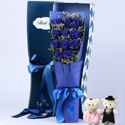 精选11朵蓝色妖姬,情人草或满天星间插,2只小熊