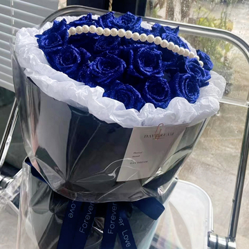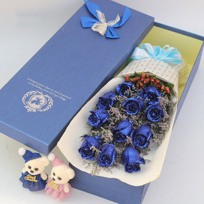蓝色珠光纸扇形包装,蓝色缎带扎束,蓝色长方形盒装。花语:我要用沧海桑田不变的爱来打动你的心,用海枯石烂不朽的爱来滋润你的心,用一生一世永恒的爱来呵护你的心。附送: