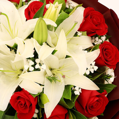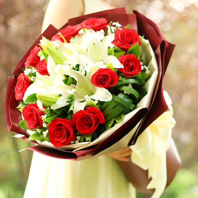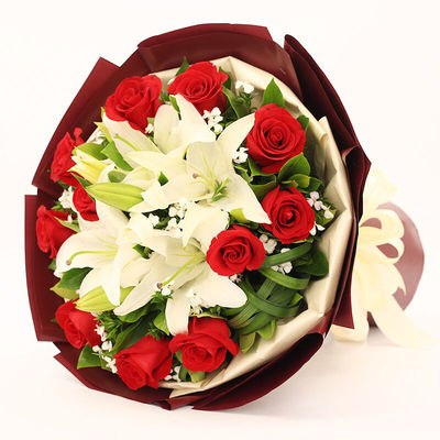 11朵红玫瑰,2枝多头百合,相思梅、丝带草点缀,栀子叶间插