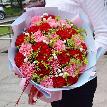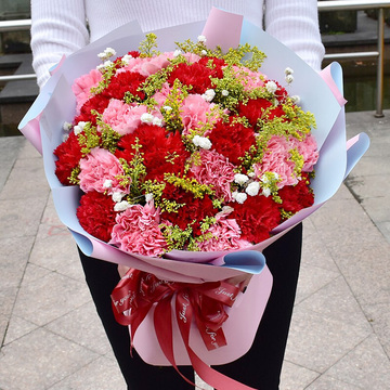 33朵红色和粉色康乃馨混搭,黄莺间插,白色满天星点缀