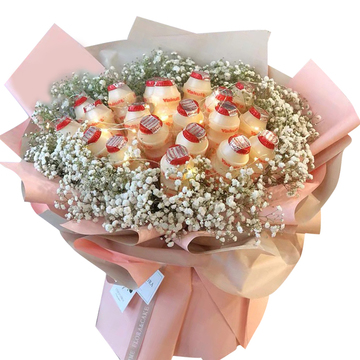 10支白玫瑰,9支香槟玫瑰,勿忘我点缀搭配。