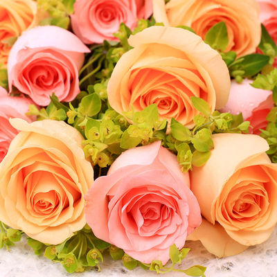 10朵戴安娜粉玫瑰+9朵香槟玫瑰,叶上黄金间插