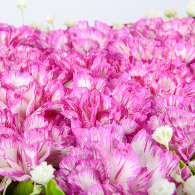 19朵紫边康乃馨,绿叶、尤加利、满天星外围