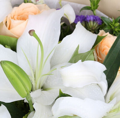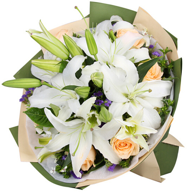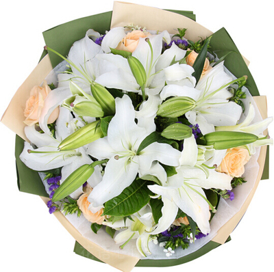 5枝多头白百合,6朵香槟玫瑰,相思梅、黄莺、勿忘我搭配。