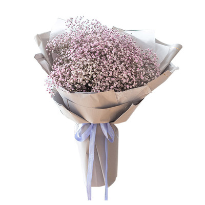 内衬浅紫色绵纸,外层英文报纸叠角包装,粉色缎带束结花语:我有一个美丽的心愿,愿你永远幸福年轻,永远像花朵一样芬芳馥郁附送: