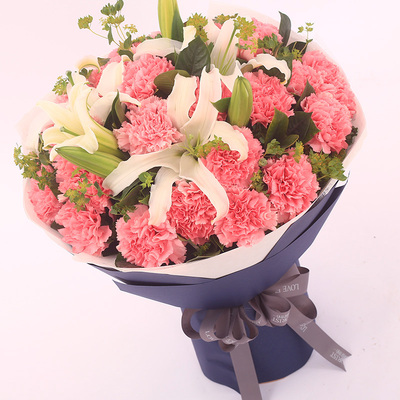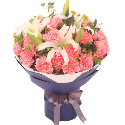 19支粉色康乃馨+2枝白色多头百合,搭配适量栀子叶,叶上黄金(或黄莺)点缀