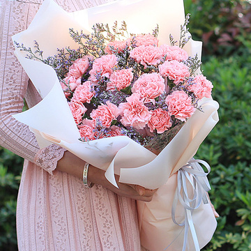 21朵粉康乃馨,情人草(或满天星)丰满搭配