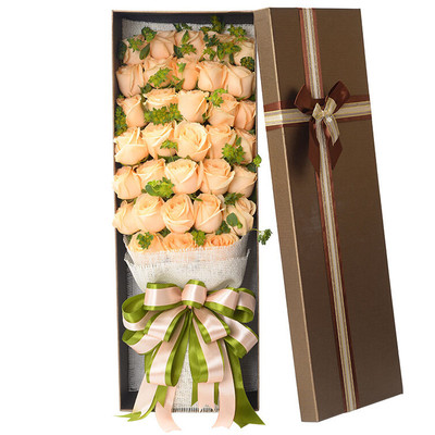 内衬白色素纸,外层深绿色厚牛皮纸圆形包装,咖啡色缎带束扎。花语:我对你的爱如阳光般灿烂。附送: