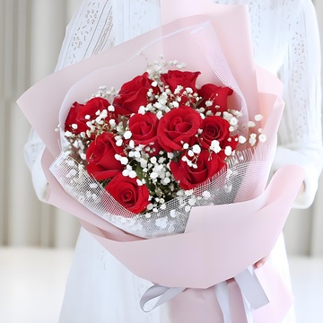 11朵红玫瑰,满天星,黄莺丰满点缀。