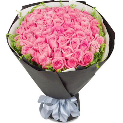 内衬白色卷边纱,外围粉色磨砂纸,表面蝴蝶结装饰,蝴蝶结束扎花语:日夜为你着迷,时刻为你挂念,思念是不留余地附送: