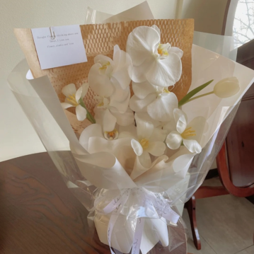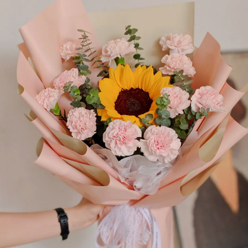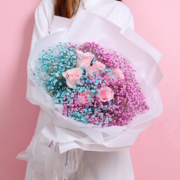 内衬白色雪梨纸,外层粉色欧雅纸扇形包装,条纹缎带束扎花语:你在我的心里,没人能代替,日日夜夜守护你,不离不弃附送: