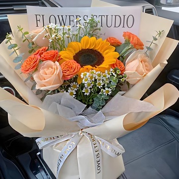 3朵香槟玫瑰1支向日葵,2支橙色芭比泡泡,白色洋甘菊
