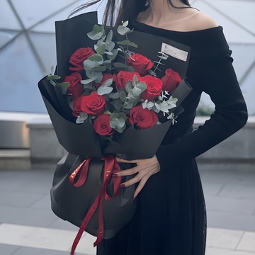 黑色包装纸圆形包装,红色缎带束扎花语:你在时你是一切,你不在时一切是你!附送: