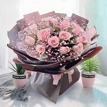 19朵戴安娜粉玫瑰,粉色满天星点缀,银叶菊搭配