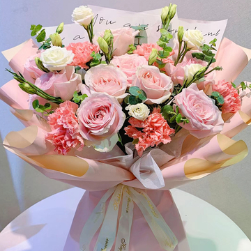 白色雾面纸内衬,灰+粉欧雅纸层次包装花语:花儿说,为了你我不愿随风而去;花儿说,珍藏我们的记忆就是珍藏甜蜜!附送: