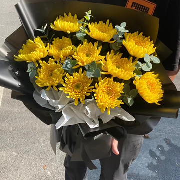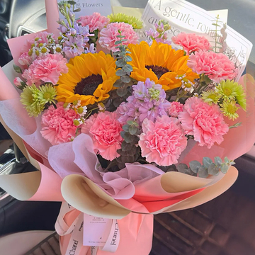 6朵香槟玫瑰,2支向日葵,5支多头白桔梗,3支粉桔梗,5支橙芭比,蓝星花,黄莺或尤加利搭配