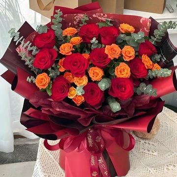 由于鲜花包扎各地的花艺师不同,可能在花束的形式和搭配上与图片不完全一致,但我们保证鲜花的主花材品种、新鲜程度、数量、颜色与说明一致,谢谢。说明: