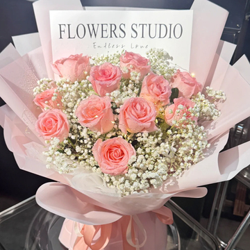 11朵戴安娜玫瑰,白色满天星丰满间插,灯带装饰