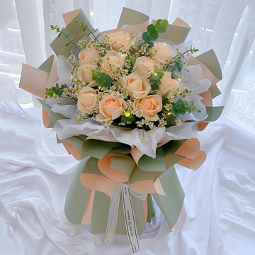 11支香槟玫瑰,洋甘菊和尤加利间插、一条灯带