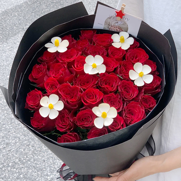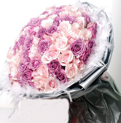 灰色包装纸圆形包装,银灰色缎带束扎。花语:在这安静的深夜,我让思念慢慢开出花蕊,吐露爱恋的芬芳,陶醉怡人的月光,给你一路的温暖。附送: