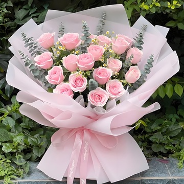 21朵粉佳人玫瑰,洋甘菊尤加利间插