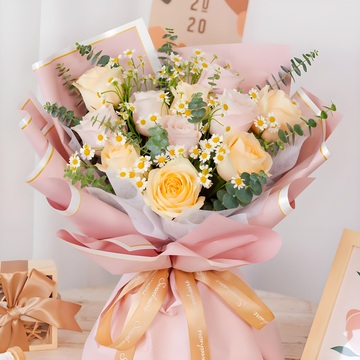 6朵香槟玫瑰,5朵戴安娜,白色洋甘菊间插,尤加利