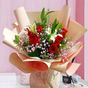 7朵红玫瑰,2支多头白百合,粉色满天星、栀子叶搭配