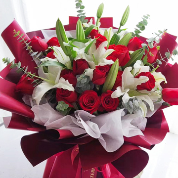 19朵红玫瑰,白色石竹梅和绿叶丰满搭配