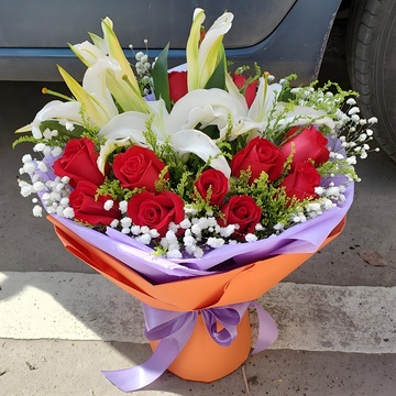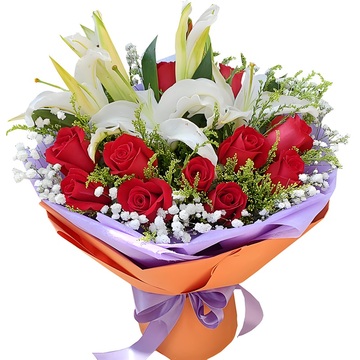 紫色、桔色纸包装,紫色缎带花结。花语:轻轻的一声问候,融入了所有的心愿;淡淡的一句祝福,倾注了无限的真诚;在忙碌交织的岁月里,我会永远珍惜。附送: