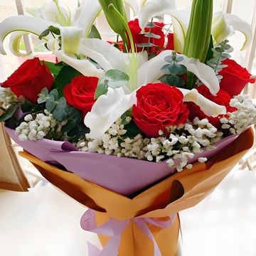 红玫瑰11朵,2枝多头白百合,绿叶,白色满天星;