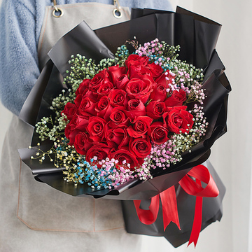 黑色牛皮纸圆形包装,红色缎带束扎花语:执子之手,与子偕老!附送: