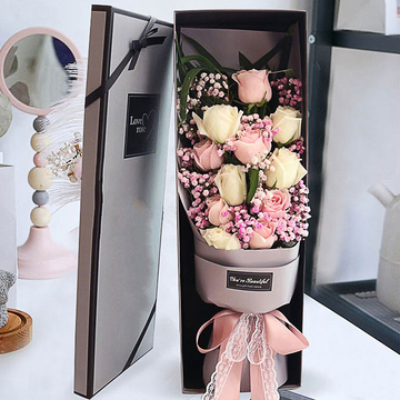 6朵白玫瑰、6朵戴安娜粉玫瑰,粉色满天星点缀,绿叶搭配