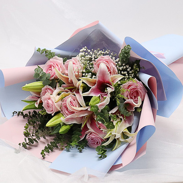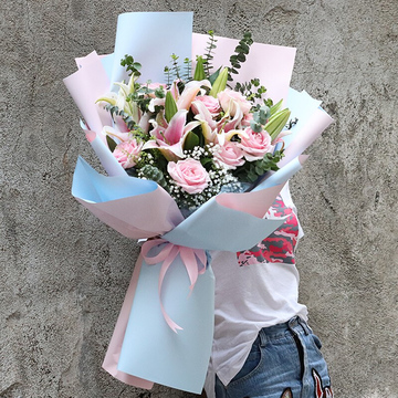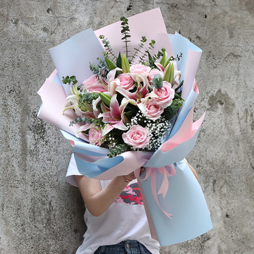 粉色+浅蓝色双面欧雅纸层次扇形包装,粉色缎带束扎花语:这一刹那迸出的光芒,将照亮你快乐的一生附送: