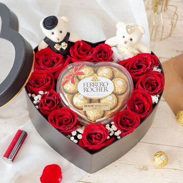11朵红玫瑰,1盒100g费列罗巧克力,1对小熊