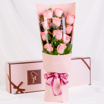 粉色牛皮纸扇形包装,玻璃纸包裹,粉红缎带束扎,礼盒装花语:爱你就是这么莫名其妙,就是这么义无返顾,我知道我不会是你今生的唯一,但你却是我一生的最爱!附送: