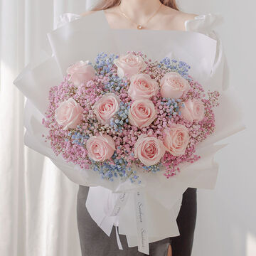 11枝粉雪山玫瑰搭配蓝色和粉色满天星