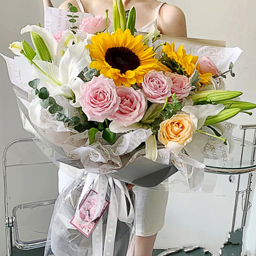 8朵安娜粉玫瑰,1朵香槟,2支向日葵、4支多头白百合、尤加利搭配